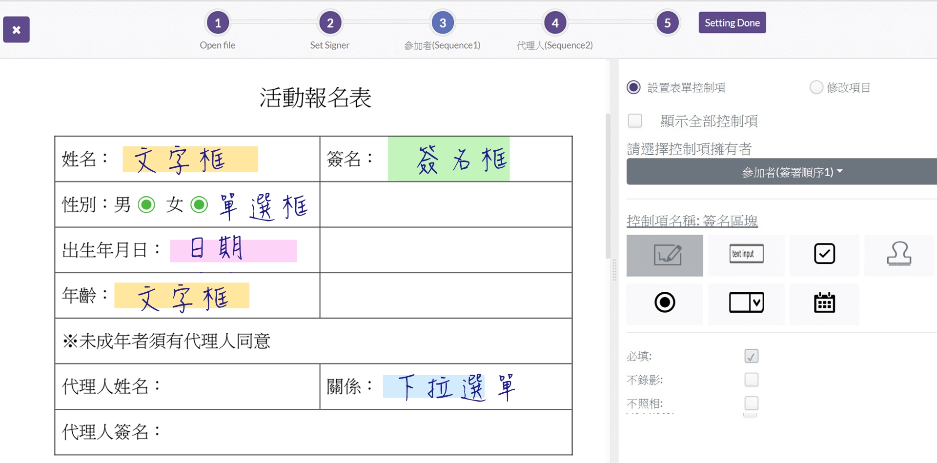 可插入簽名框、文字框、勾選框等控制項,提供填表、簽名一次完成